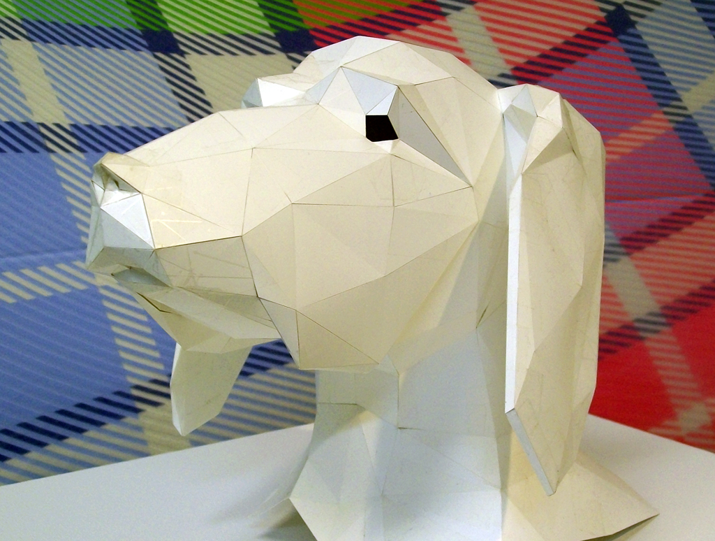 Mascot (dog head), sheet polystyrene, tissue paper and tape, 46 x 64 inches
