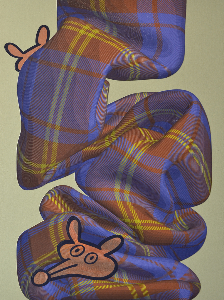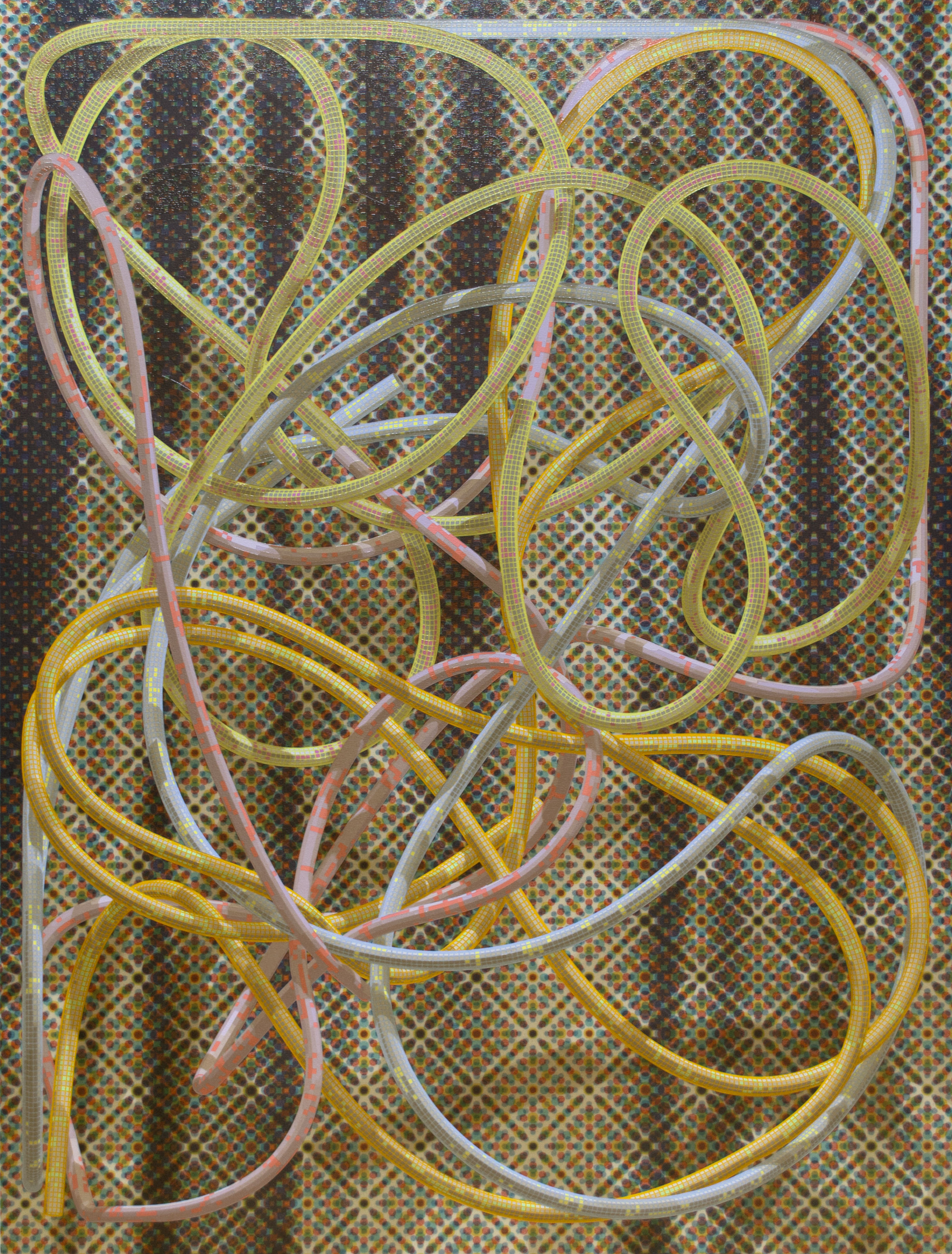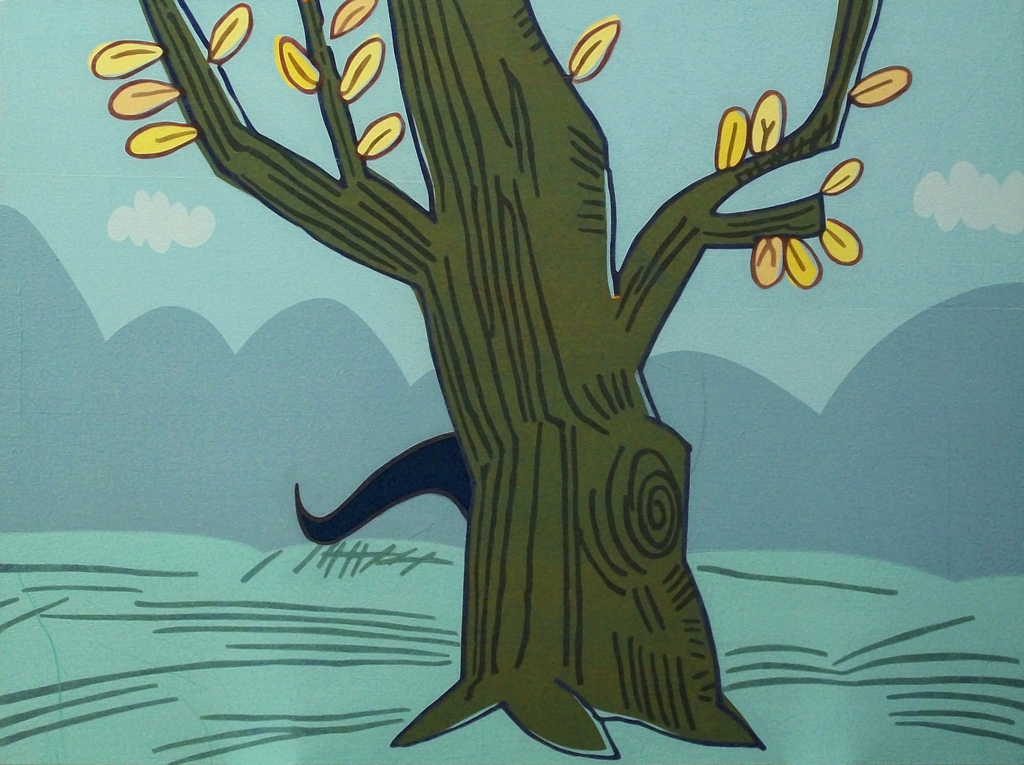 Tail (after a still from “Dudley Do-Right of the Mounties”), tissue paper, colored pencil and acrylic on canvas, 36 x 48 inches